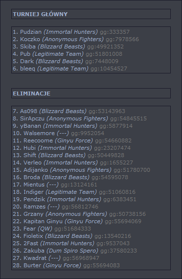 Witam wszystkich i po pierwsze dziękuję, że aż tyle osób się zapisało, jest to porównywalna ilość osób, jaka brała udział w poprzednich edycjach Mistrzostw Polski. Wygląda to tym bardziej imponująco, jeśli weźmiemy pod uwagę jak wyglądała aktywność na scenie w ciągu ostatnich kilku miesięcy. Dzięki!