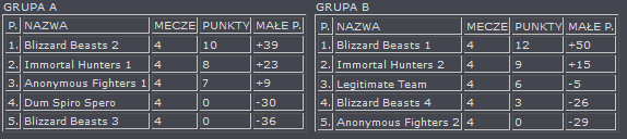 Jak widać, w związki z drugim miejscem zajętym w swojej grupie przez faworyzowany klan Immortal Hunters 1, będziemy świadkami przedwczesnego finału, gdyż na przeciwko siebie staną najlepsze ekipy z BB oraz IH. Drugą parę natomiast utworzą drugie ekipy BB i IH. Co tu dużo mówić - oba pojedynki zapowiadają się epicko, i oby takie były. Zachęcam do śledzenia wyników i gratulacje dla tego, kto poprawnie przewidzi wyniki. HF!